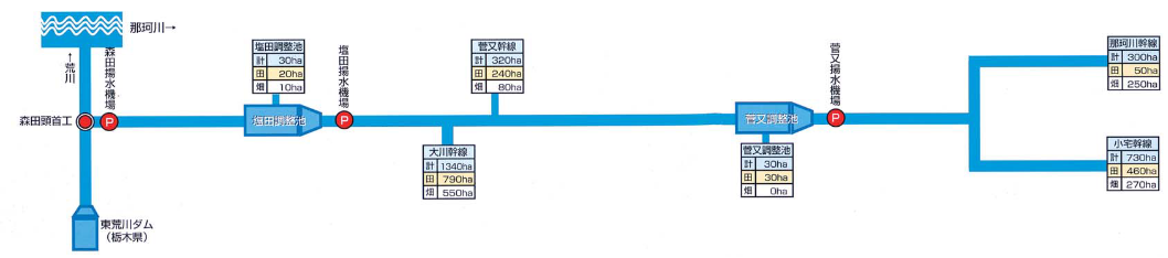 東荒川ダムに貯えた水と荒川の自流水を合わせて、森田頭首工で最大毎秒1,763㎥の農業用水を取水します。取水された水は森田揚水機場から塩田調整池まで送水されます。塩田調整池からは塩田揚水機場で大川吐水槽及び菅又吐水槽へ送水、また、菅又調整池に送水した用水は、菅又揚水機場から小宅吐水槽へ送水され、幹線用水路及び支線用水路により各圃場へと配水されます。